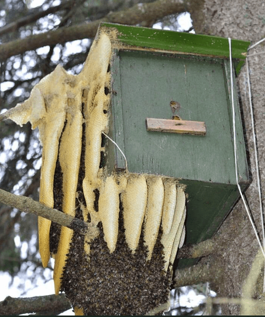 Пчелы вели себя мирно и не жалили. Они уже успели отстроить пустые и обновить черные не нужные рамки. Удивительно, но рой обладает такой трудовой энергией, что ему не страшна никакая работа. Если в гнезде пчелы не любят отстраивать поврежденные мышами рамки, так как от них идет противный пчелам запах, то рой отстраивает такие рамки в легкую. Причем замечено, что рой любит, когда в ловушках стоит черная сушь, пчелы её обновляют чистят. Отстраивают пустые рамки и поврежденные. Когда будете ставить пустые рамки в ловушку, то не забудьте по возможности поставить старую сушь. Пчелы обязательно это оценят, ведь они летят с запасом меда, а тут уже есть место куда сложить мед. Я ставил старую сушь и вощину и все пчелы прекрасно отстроили и обновили.