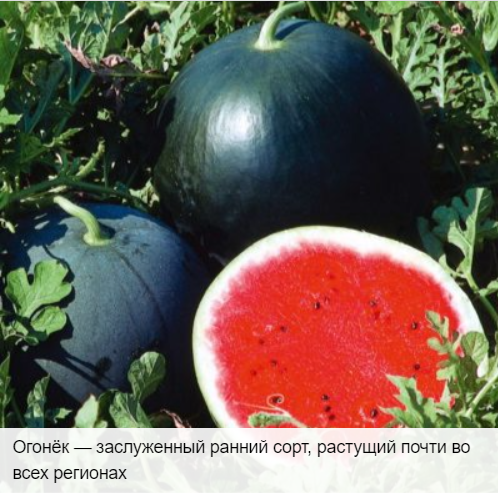 Огонёк — чрезвычайно популярный раннеспелый сорт, известный ещё со времён СССР. Плоды маленькие (около 2 кг), семечки в них очень мелкие, а мякоть отличного нежного вкуса. Кора тонкая, её окраска чёрно-зелёная с размытым рисунком. Сорт способен полностью вызревать в Центрально-Чернозёмном, Восточно-Сибирском и Дальневосточном регионах.