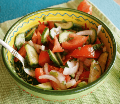 Состав: Салат зеленый 200гр.  Свежие помидоры и огурцы 2-3 шт. Салатная заправка или сметана  ½  стакана.