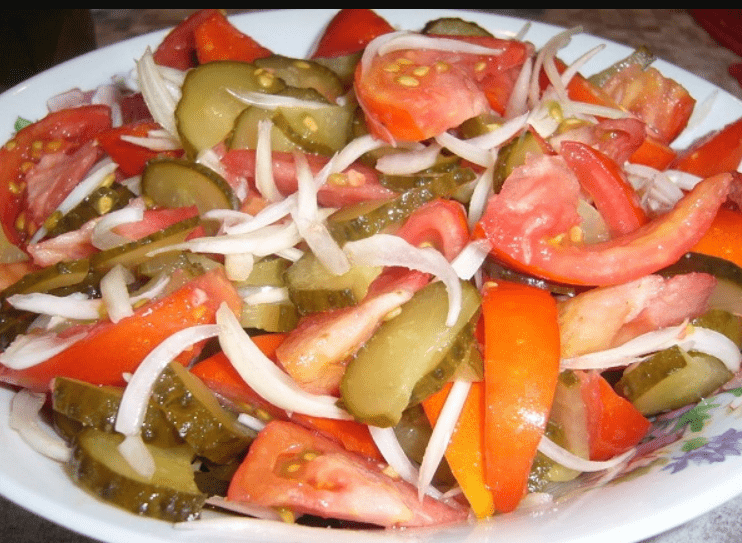 Состав продуктов: Помидоры 4шт. Огурцы  соленые 2-3 шт.  лук репчатый 1-2 шт. Заправка для салатов ¾  стакана или растительное масло 100гр.