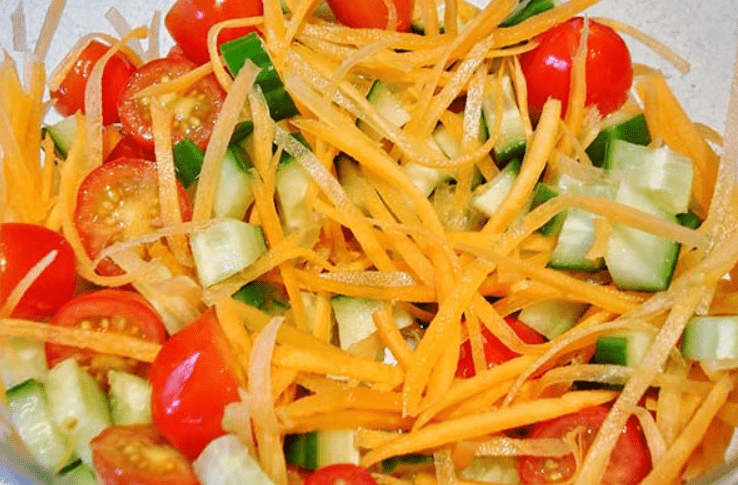 И так приступим. Сырую морковь необходимо  натереть на крупной терке, можно по желанию нарезать тонкой соломкой. Помидоры нарезать кружочками.  Огурцы ломтиками или кружочками. Нашинковать зеленый лук.  Часть зеленого салата нарезают, а вторую часть оставляют. Подготовленные продукты смешивают, солят, заправляют майонезом или сметаной и укладывают горкой в салатнике.  Украшают листьями зеленого салата и посыпают мелко нарезанной зеленью.