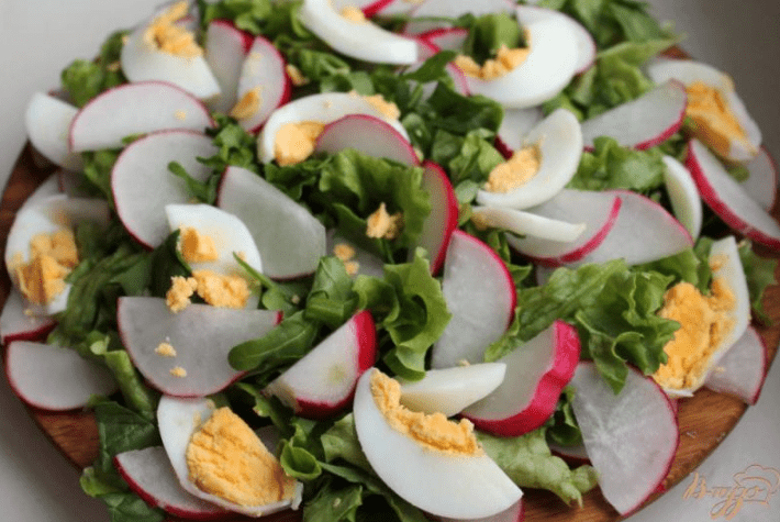 Редис и свежие огурцы нарезают кружками или полукружками. Шинкуют зеленый лук и нарезают листья салат на 3-4 части. Все приготовленные ингредиенты  смешивают с половиной нормы сметаны. После все кладут в салатницу  и поливают сверху другой частью сметаны и украшают яйцами, салатом, так же можно посыпать и украсить мелко нарезанной петрушкой или укропом.